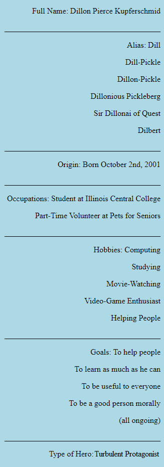 Dillon firmly believes in being good and trying to help people. For those reasons, he is typically very kindhearted in nature, but sometimes this can do him more harm than good, namely because it also leads him to have a level of naivete in certain instances.
